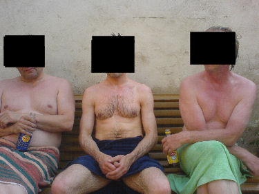 Harmaväki kävi juhannussaunassa jälleen. Miesten puolella oli aivan täyttä heti alusta alkaen. Naisten puolella ei ollut kuin kolme saunojaa: Malle, Pirita ja kolmas, jonka nimi ei valitettavasti jäänyt mieleen. Hänen nimensä kuulosti vierasmaalaiselta toisin kuin Mallen ja Piritan. Saimme heiltä luvan mennä naisten puolelle, koska siellä oli väljempää. Noin tunnin yhteissaunomisen jälkeen Pirita, entinen malli muuten, suostui ulos kuvattavaksi. Tästä ei valvoja enää pitänyt ja siihen loppui yhteissaunominen.