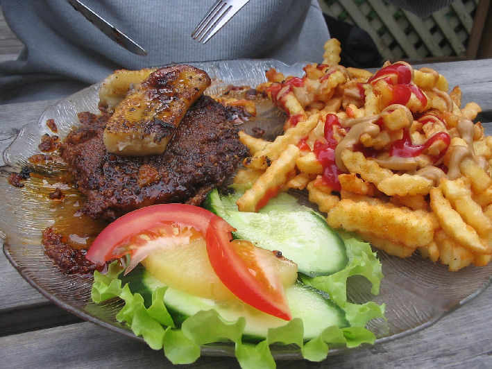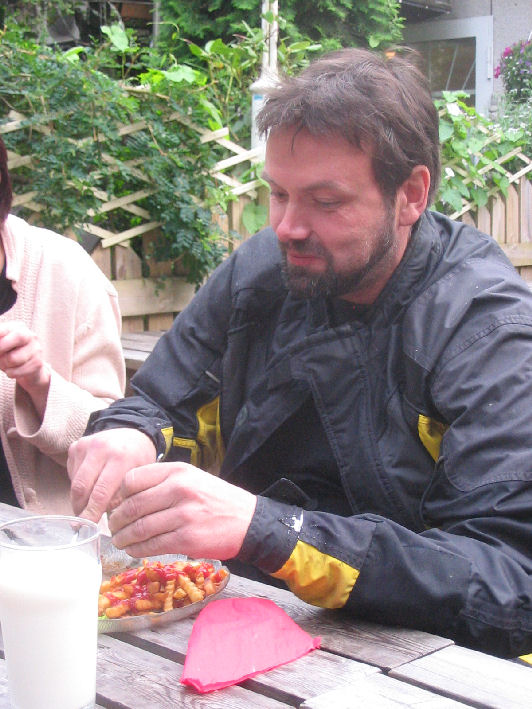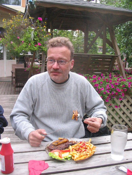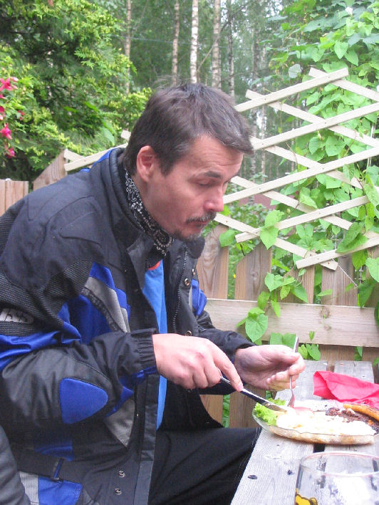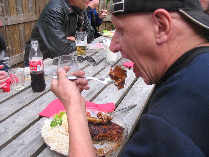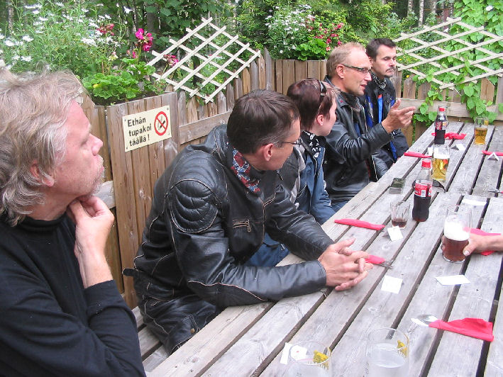Sateen uhka oli jälleen niskassa matkaan lähdettäessä, kuten on tainnut olla koko kesän, vaan eipä satanut. Matkaan rohkeni lähteä 8 pyörää ja 9 henkilöä. Hallitus on hyväksynyt yhden uuden jäsenen kerhon. Lisäksi statustaan nosti kaksi jäsentä, joista yksi kahdella pykälällä eli kahdella pihvillä. 440 g sitä itseään samalla lautasella!!!! Hän oli neljäs klubin tuplapihvin syöjä. Hallitus ei suosittele.