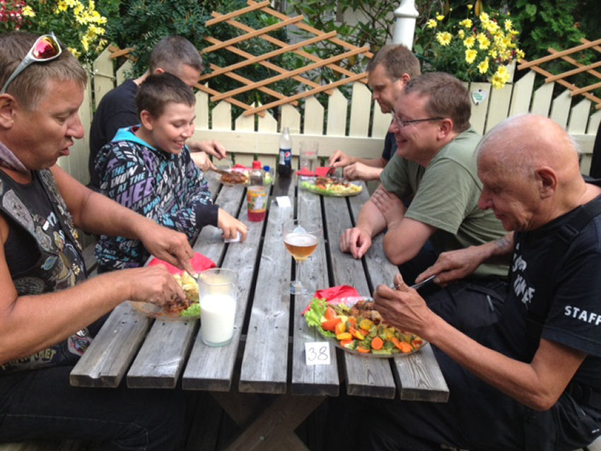 Kuvia 08.08.2013 Vihdoinkin sateiden piinaamat torstai-illat olivat ohi. Matkaan lähti mukavan kokoinen joukko motoristeja. 6 henkilöä suoritti aterian hien pyyhkimisen ja niiskutusten myötä. Klubiin saatiin 2 uutta jäsentä.