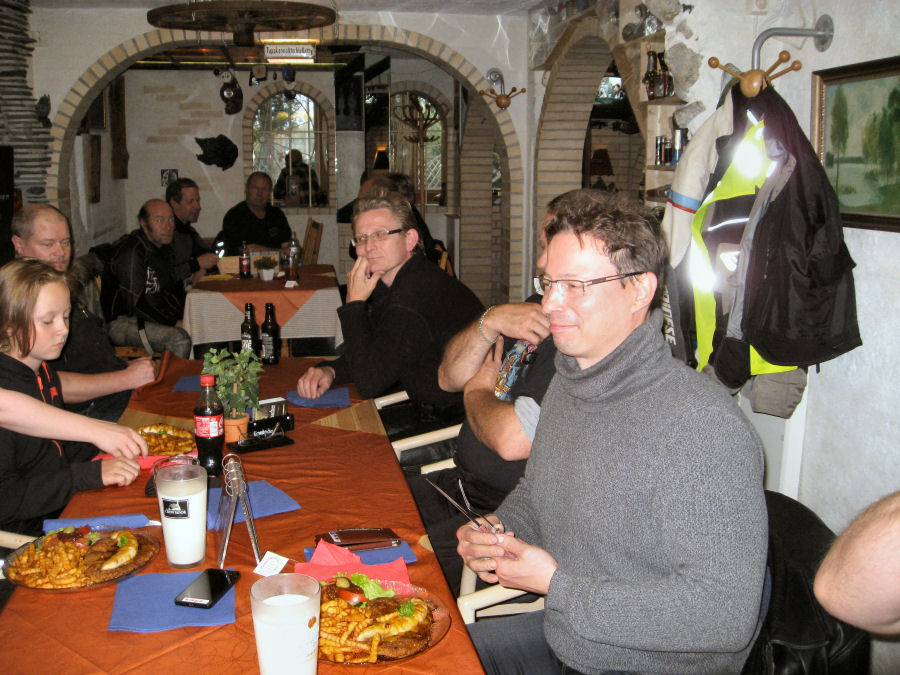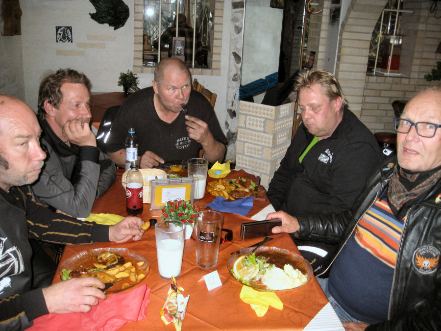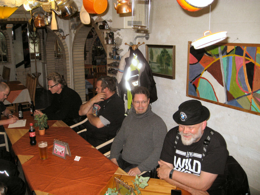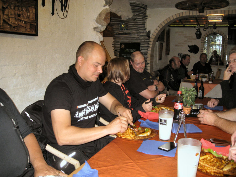 Viidentoista pyörän letkaan liittyi vielä matkan varrelta kaukaa syrjäiseltä rannikkoseudulta matkaan lähtenyt nälkäinen motoristi. Ajelu saatiin suoritettua perinteisintä reittiä roadcaptain Veijon johdolla. Tilauksia tehtiin kiitettävästi, kolme tuplaa ja kymmenen single-annosta. Veli-Veijo sai raivoisat aplodit suoritettuaan 50. pihvinsä, myös kaikki kolme noviisia saivat pihvit suoritettua sääntöjen määräämällä tavalla ja heille tehtiin numerovaraus. Australian hallitus tarkistaa suoritukset ja vahvistaa jäsennumerot seuraavassa kokouksessaan. Hangaround-kokelas sai kannustusta sekä veljeskunnan jäseniltä että tämän ajon noviiseilta, mutta niin vain jäi suoritus kesken sisukkaasta yrityksestä huolimatta. Kesäillan hämärtyessä saimme ravitsemusliikkeen henkilökunnan edustajan ottamaan porukastamme valokuvan muistojen albumiin liitettäväksi.