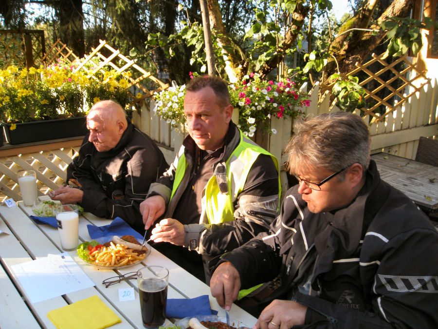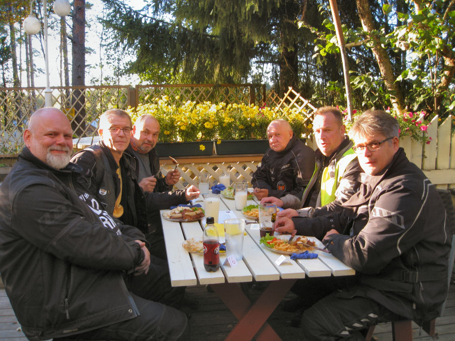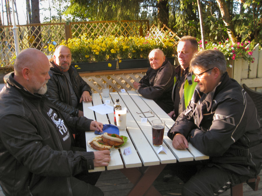 Alkusyksyn säätila helli nälkäisiä kerholaisia lähes pilvettömällä taivaalla ja parinkymmenen asteen lämpötilalla. Kokoontumispaikalle oli saapunut roadcaptain Veijo kerhomerkkivastaava Jukan kanssa. Nyt sekä viime että tämän kesän uudet jäsenet saivat kauan kaipaamansa kunnioitusta herättävät kerhomerkit liiveihin ommeltaviksi. Tämä parivaljakko suuntasi avoautolla eri suuntaan muiden kerholaisten asetellessa aurinkolasit silmilleen ja jyräyttäen koneet tulille. Matka taittui kellastuneiden lehtien reunustamia teitä rauhallisesti kruisaillen. Toijalasta lähtenyttä viiden pyörän letkaa oli vastassa Espoosta matkaan lähtenyt kerholainen. Jokaisella ajokerralla voi vain ihmetellä sitä hymyilyn ja iloisten ilmeiden määrää, joka odottaa kerholaisia tuttuakin tutummassa ravitsemusliikkeessä. Pihvejä tällä kerralla tilattiin kahden tuplan ja kolmen singlen verran, yksi kerholainen pitäytyi aivan muunlaisessa ruokalajissa. Kassalla meitä maitopoikia varoitettiin, ettei kaikille riitä apilaviskiä ruokajuomaksi, mutta viimeisenä tilauksen suorittanut Peltipötsikin sai tuopillisensa. Makoisat pihvit tämä seurue nautti terassilla auringon paisteessa, mieli tosin oli syksyisen haikea kurkiauran lentäessä ylitsemme ikään kuin jäähyväisiä jättäen. Paluumatka sujui auringonlaskua ihaillen vielä yhtä vuoden 2016 ajokertaa ajatellen.