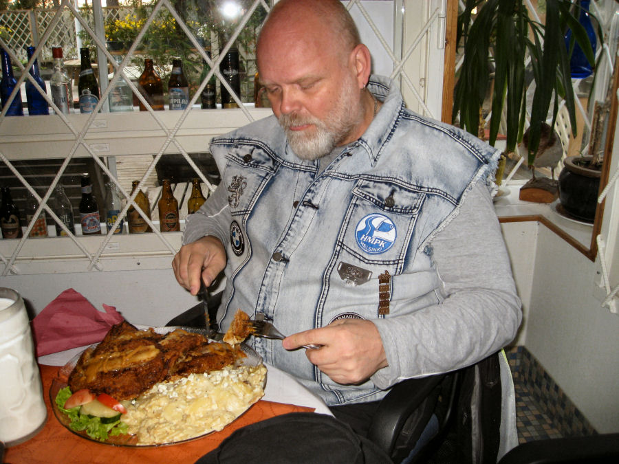 Kesän viimeiselle ajolle kerhomme oli saanut vielä yhden uuden kokelaan. Peltipötsin johdolla nälän kurniessa vatsoissa kolmen pyörän letka ajeli tutuinta ja samalla nopeinta reittiä pihvien luokse. Tämän Toijalan trion jyristellessä keltaisten koivujen reunustamalle parkkipaikalle oli Espoosta matkaan lähtenyt Messinkimasu jo suorittanut tilauksensa: Harmagedon annos kolmella lisäpihvillä! Tämän rinnalla alkoi Peltipötsin tripla tuntua hyvin vaatimattomalta suoritukselta, muttei hän kuitenkaan lähtenyt kilpaan mukaan vaan tilasi perinteisen tuplan. Sekä jäsennumeronsa lunastanut kerhon jäsen että tämän kertainen noviisi tyytyivät single-annokseen. Peltipötsi seurasi silmä tarkkana, ettei quatron kohdalla vain tapahdu huijausta ja sillä välin kuin huomaamatta tupla solahti pötsiin. Kolmen pihvin jälkeen oli Messinkimasun nostettava kädet ylös ja todettava: ”Ei jaksa!” Hän sivusi näin ollen Peltipötsin tripla-ennätystä ja sai ansaitsemansa aplodit tästä suorituksesta. Noviisimme puhkui annoksensa kimpussa hyvän tovin, mutta niin vain hän sai pihvin banaanin puolikkaineen suoritettua. Saman tien hänelle tehtiin numerovaraus jäsenrekisteriin ja Australian hallituksen tarkastuksen jälkeen hänen jäsennumeronsa ja statuksensa kerhossa voidaan vahvistaa. Noviisimme sai kerrassaan raivoisat aplodit muulta seurueelta ravitsemusliikkeessä ruokailleiden amerikkalaisten turistien hämmennykseksi. Pihviä hän kommentoi: ”Alku meni helposti, loppua kohti vaikeutui, oli tosi tulista.” Tämä tuli todistettua myös kokeneen pihvinpurijan kohdalla: numeronsa lunastanut jäsen joutui jättämään puolet pihvistä lautaselleen. Kesän saldoksi muodostui kahdeksan uutta jäsentä kerhossa, mikä osaltaan todistaa kerhon tärkeydestä! Haikein mielin jätimme jäähyväiset ravintolan henkilökunnalle ja suuntasimme pyörämme kotia kohti: ”Ensi kevääseen…”