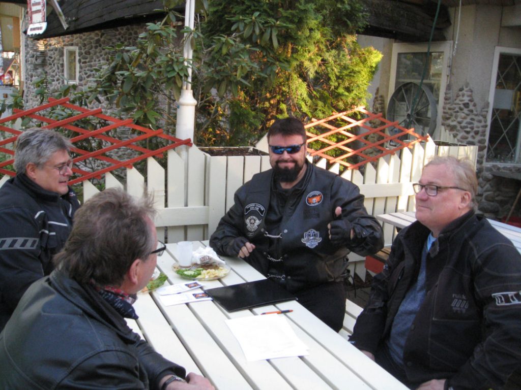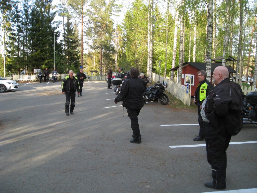 Kerhon uusi road captain Peltipötsi johdatteli upean letkan useimmiten ajettua reittiä kohti määränpäätä. Tutulle parkkipaikalle oli seuruetta vastassa muutamia omia reittejään saapunutta pihvinpurijaa, Messinkimasun kasvoilta oli mukavaa huomata todellisen jälleen näkemisen ilme!