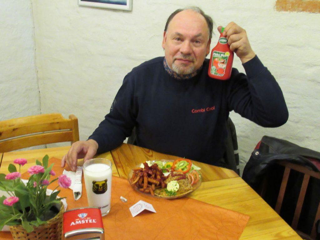 Kahdeksan henkeä oli vuoron perään tilaustaan tekemässä, mutta vain neljä statuksen nostoon oikeuttavaa: kaksi Krakatauta ja kaksi Harmagedon -annosta. Aurinkoisesta säästä huolimatta porukka päätti tyytyä nauttimaan annoksensa sisätiloissa pitkän pöydän ääressä. Poninhäntäinen kerhomerkkivastaava vetäisi merkkikassistaan jymy-yllätyksen, hän oli hankkinut mukaan pullollisen Pikku Myy -ketsuppia ”Löytölautasensa” mausteeksi. Seurueen huolehtivaiset jäsenet toki varoittelivat tämän ketsupin tulisuudesta!