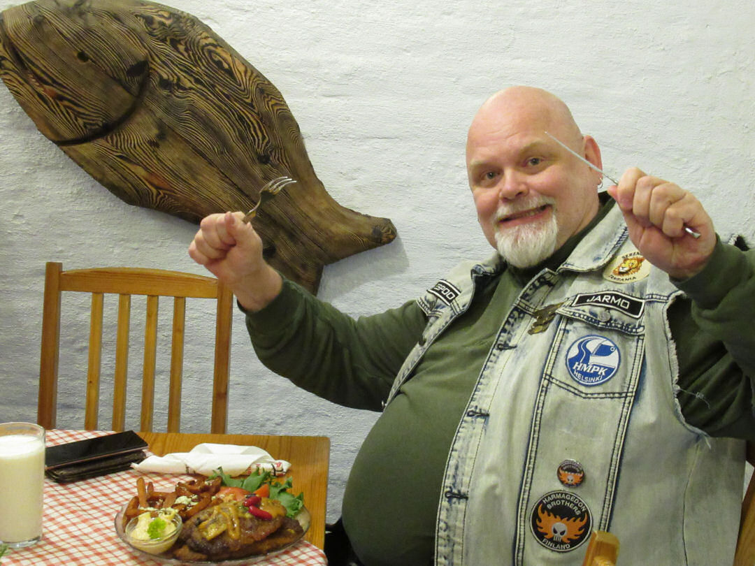 Pilvipoutaisena syysiltana kokoontui neljä motoristia Toijalan lähtöruutuun. Peltipötsi lähti vetämään letkaa tutuinta reittiä pihvejä kohti. Matka taittui mukavasti ja nelikko sai ihailla tienvarsilla olevien puiden syksyn kellastamia lehtiä. Säätiedotus lupaili myrskyä eteläiseen Suomeen ja kyllähän muutama puuska pyöriä heilauttikin. Perille päästyämme oli parkkipaikalla juuri raivaustyöt päättyneet, nimittäin asfalttialueen keskelle kasvamaan jätetty puu oli kohdannut vahvempansa. Tästä tapahtumasta Messinkimasu piti lyhyen selonteon pohjoisesta saapuneelle ryhmälle.