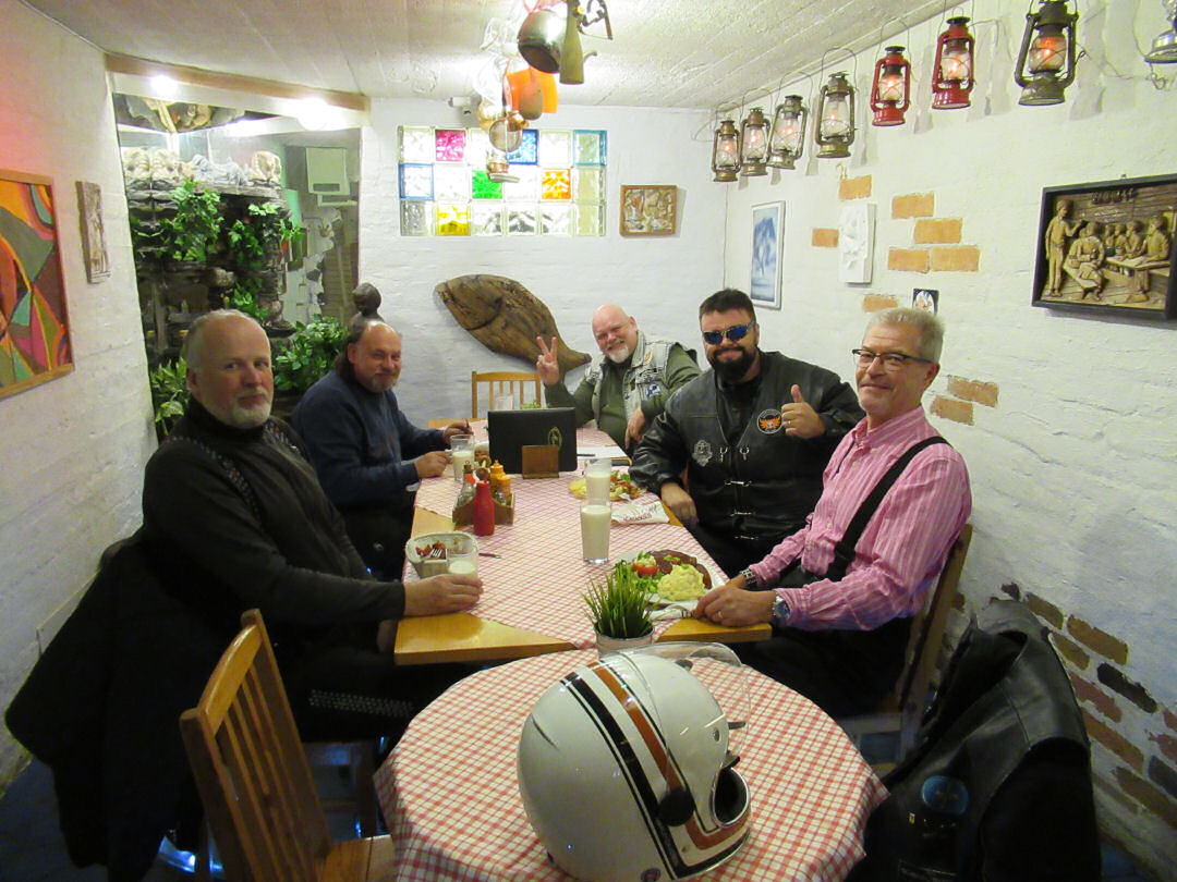 Ravintolan henkilökunnan kanssa keskustelimme ajokauden päättymisestä, tosin yksi ajo on vielä jäljellä. Samalla sovimme ensi kevään ajokauden alkamispäiväksi 13.5. Puuttomalla parkkipaikalla viisikko jyräytti kulkupelinsä käyntiin ja hajaantui ajelemaan iltaruskon vielä hieman kajastaessa pimenevässä illassa.