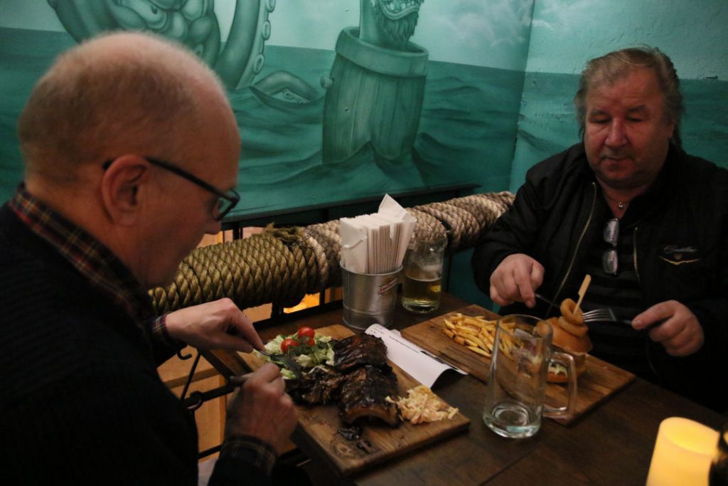 Tämän virallisen osuuden aikana oli ravintolan henkilökunta jo tuonutkin tuoppikaupalla juotavaa sekä toinen toistaan herkullisemman näköisiä ruoka-annoksia kerholaisten nautittavaksi: ribbsejä, erilaisia hampurilaisia lisukkeineen sekä kylmiä juomia. Puheensorina täytti VIP-tilat ja muutamia valokuviakin tuli otettua. Viilenevää iltaa ja kotimatkaa varten seurueen kaukaisimmat vieraat joutuivat tilaamaan lämmittäviä juomia tai peräti kaksi.