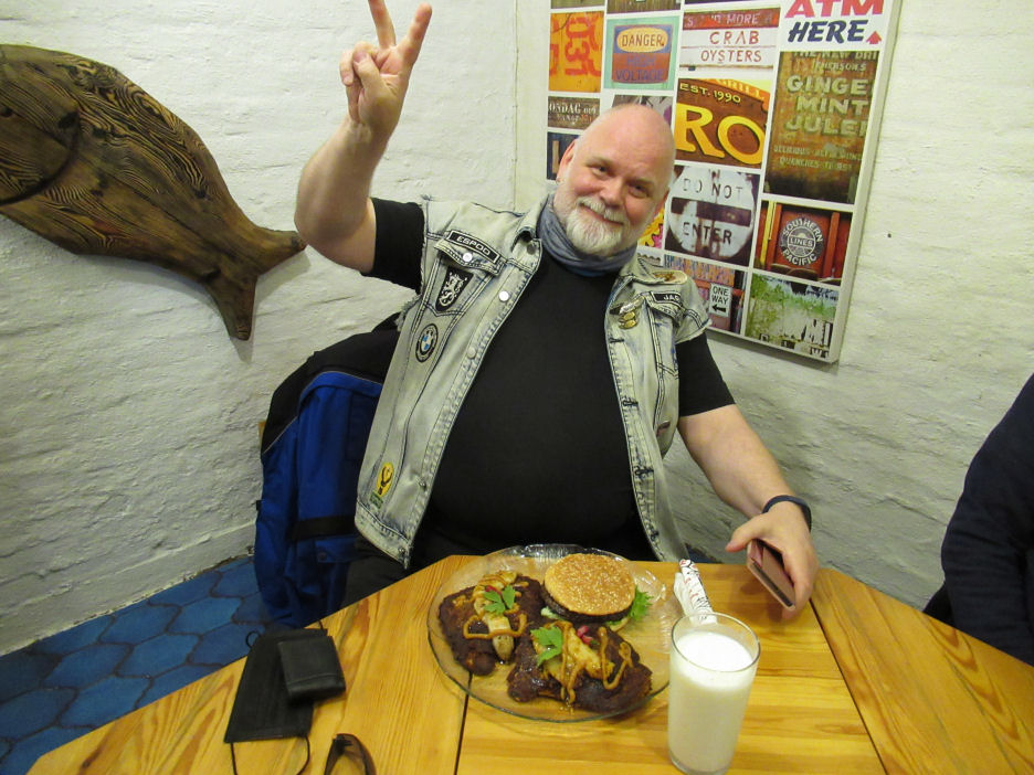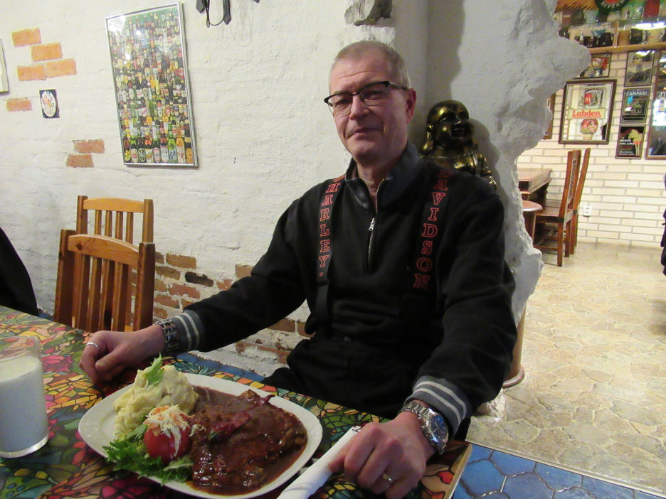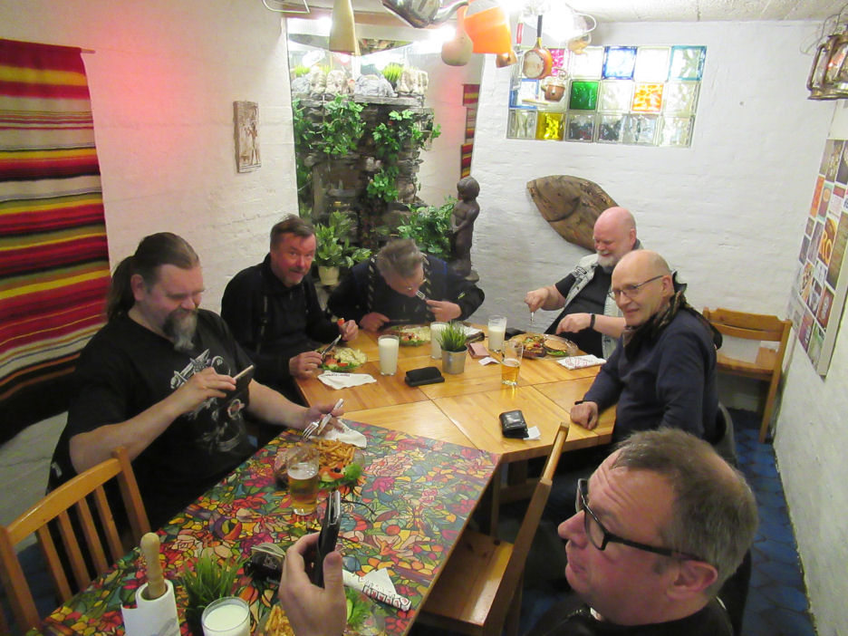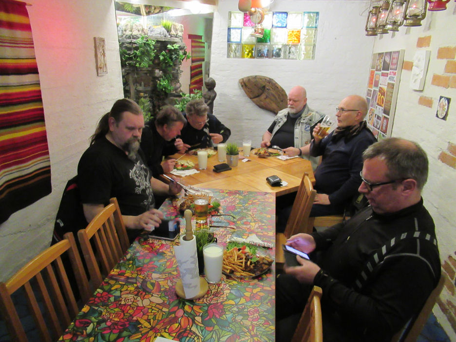 Saapuessamme kohteeseen Messinkimasu oli juuri asettelemassa kolmipyöräistään parkkiruutuun ja samassa pari muutakin jäsentä pöristeli paikalle. Siirryimme sisätiloihin, missä tutut tyttöset olivat tiskin takana toivottamassa seurueemme tervetulleiksi esitellen uuden tarjoilijattaren ja samalla meidät hänelle.